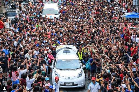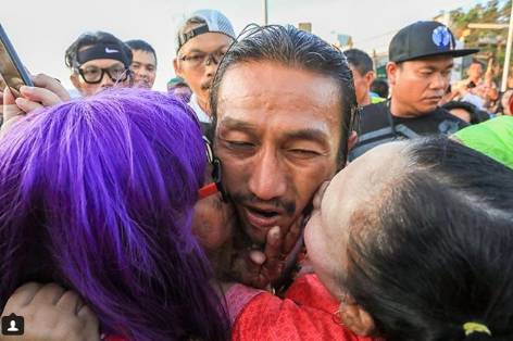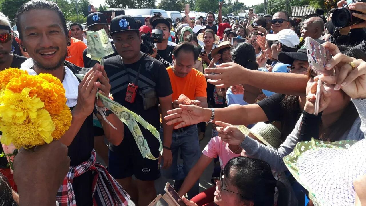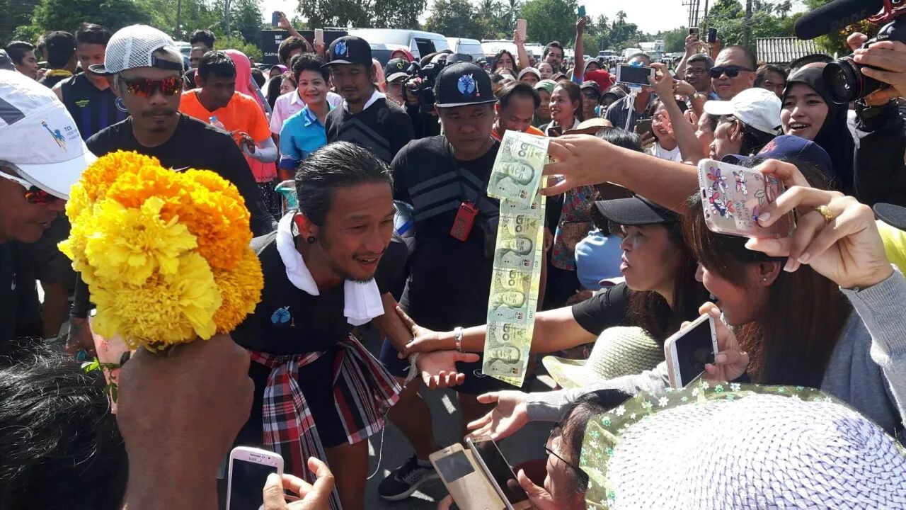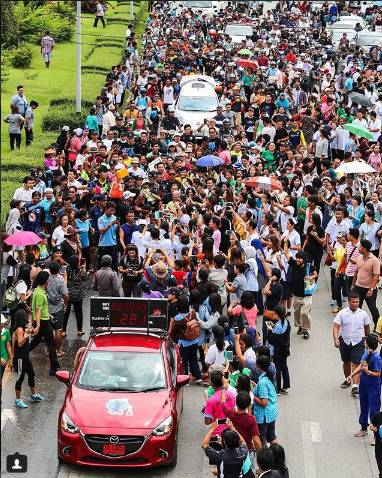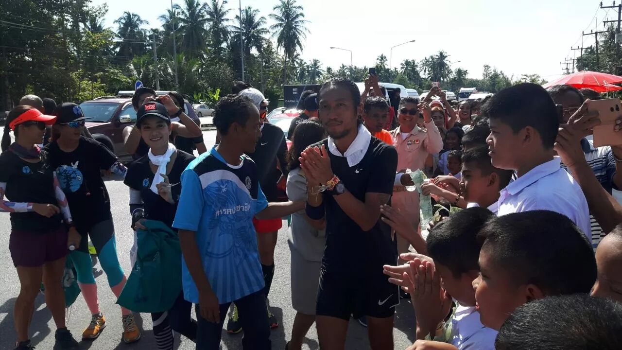 今日清早的气候特别好,没有下雨,歌手敦起步至今累计募得善款约1.98亿铢,包括洛坤府大慈善家占美捐助的1600万铢,且有望在洛坤府募款达到2亿铢。(下图,民众欢迎长跑中的敦)