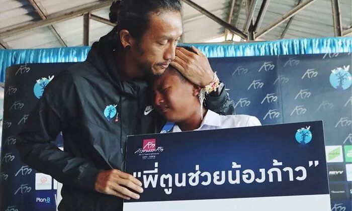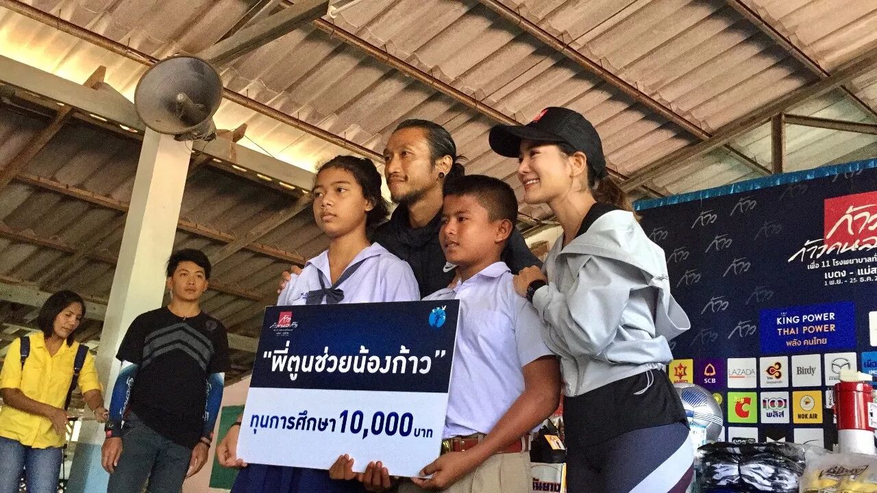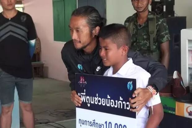 敦一行跑完首站路程后在塔沙拉区冲塔拉佛寺休息,然后使用个人银行账户中的2万铢作为助学金给2名贫穷的初中男学生,两名学生接受助学金后与敦拥抱,3人热泪盈眶。